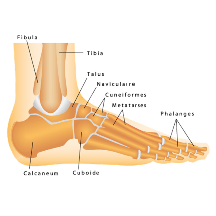 Les 26 os du pied reliés par 16 articulations constituent une mécanique complexe capable de supporter et amortir le poids du corps, servir de levier de propulsion lors de la marche ou de la course, et adapter le contact du corps au sol, notamment en terrain accidenté.